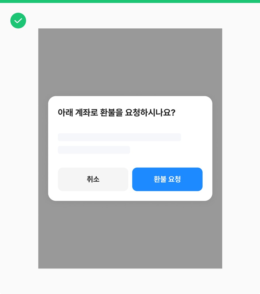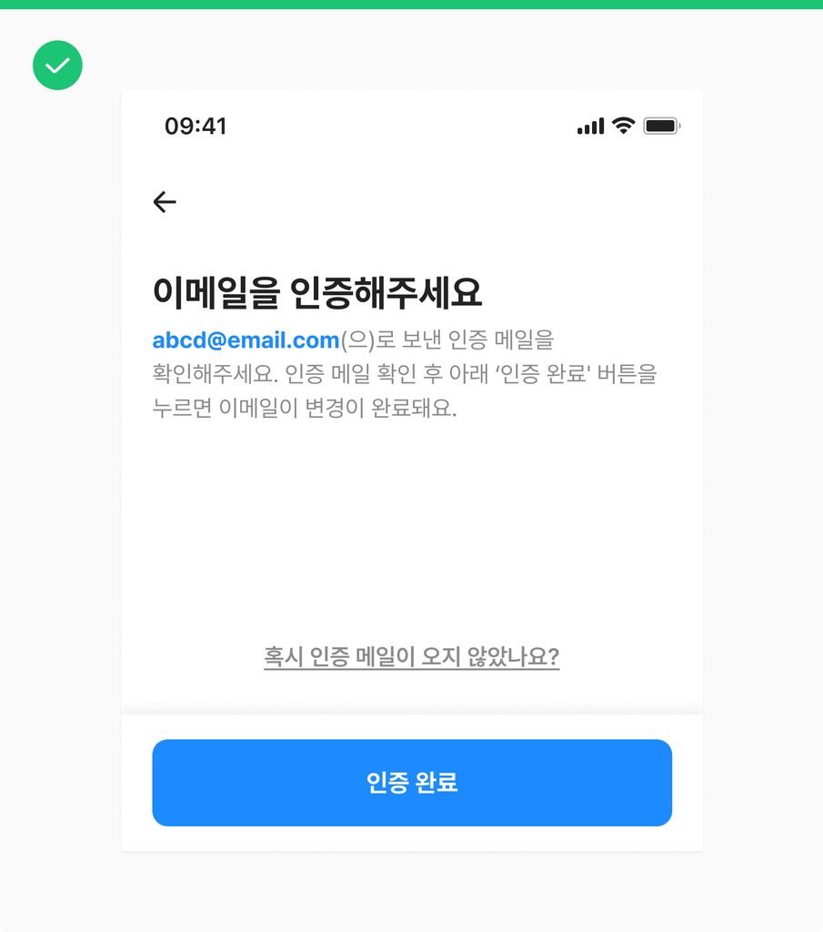 사용자가 직접 마무리 짓는 행동(선택, 인증 등)을 끝내는 버튼에 사용합니다. 단, ‘결제 완료’, ‘환불 완료'처럼 결과 상태를 표시하는 문구는 버튼에 쓰지 않고, 결과 메시지로만 사용합니다.