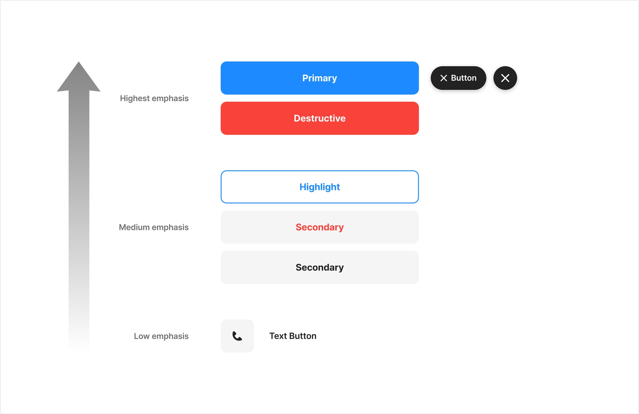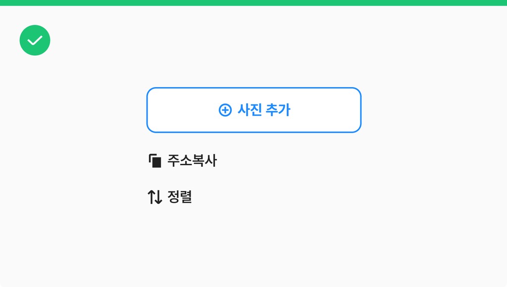 • 버튼 텍스트의 의미를 직관적으로 보조하여 사용자가 빠르게 이해할 수 있도록 합니다. • 아이콘을 통해 버튼의 기능을 시각적으로 설명하여 인지 효율을 높입니다. • 버튼의 주목성과 가시성을 강화할 때 사용합니다