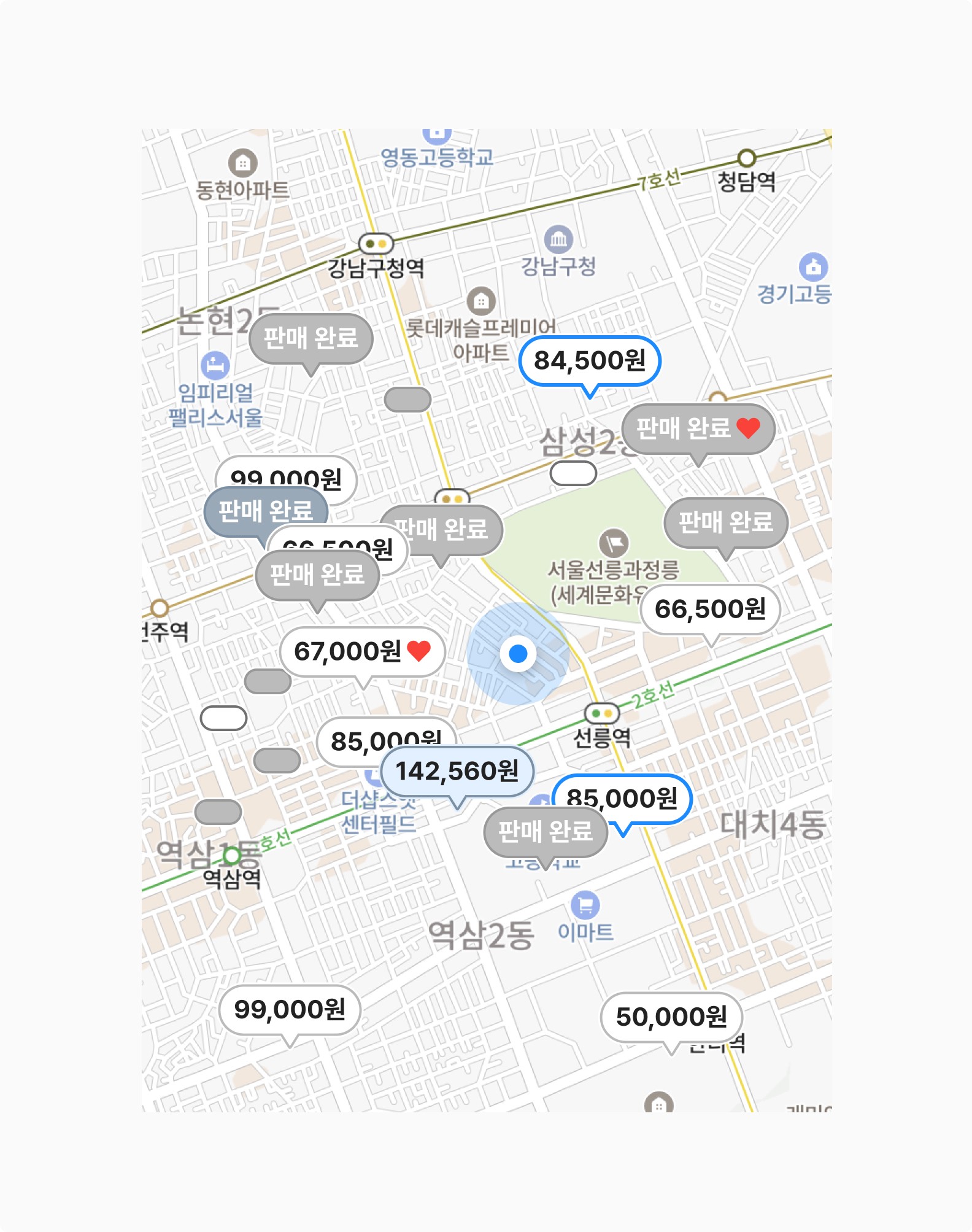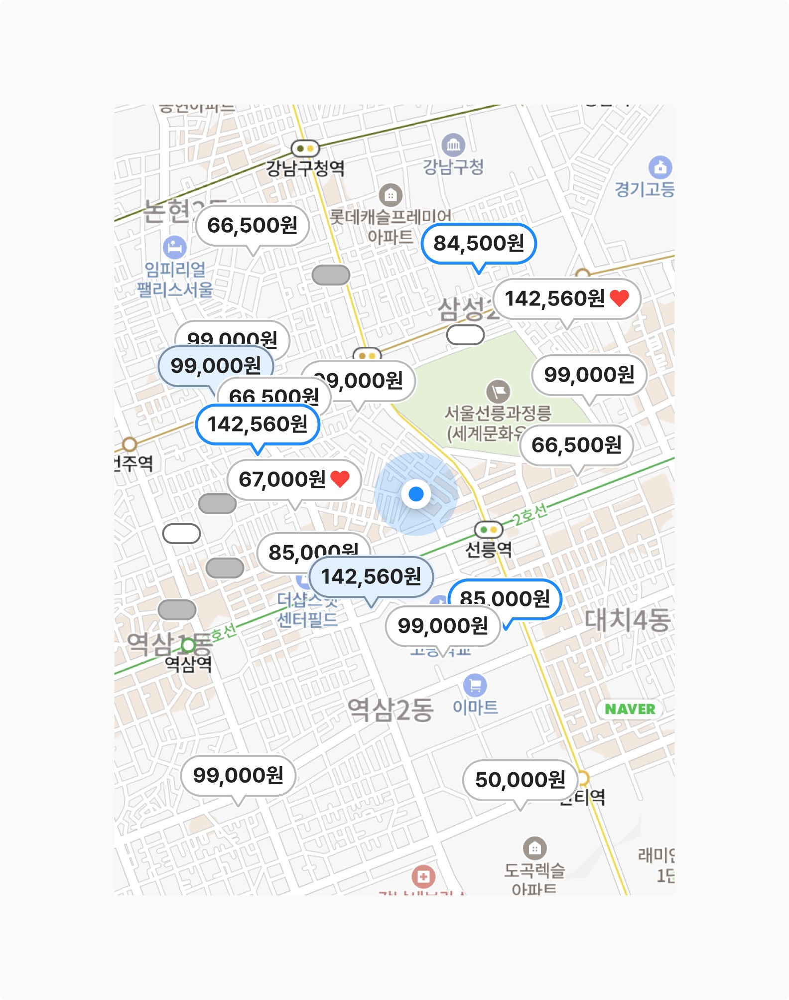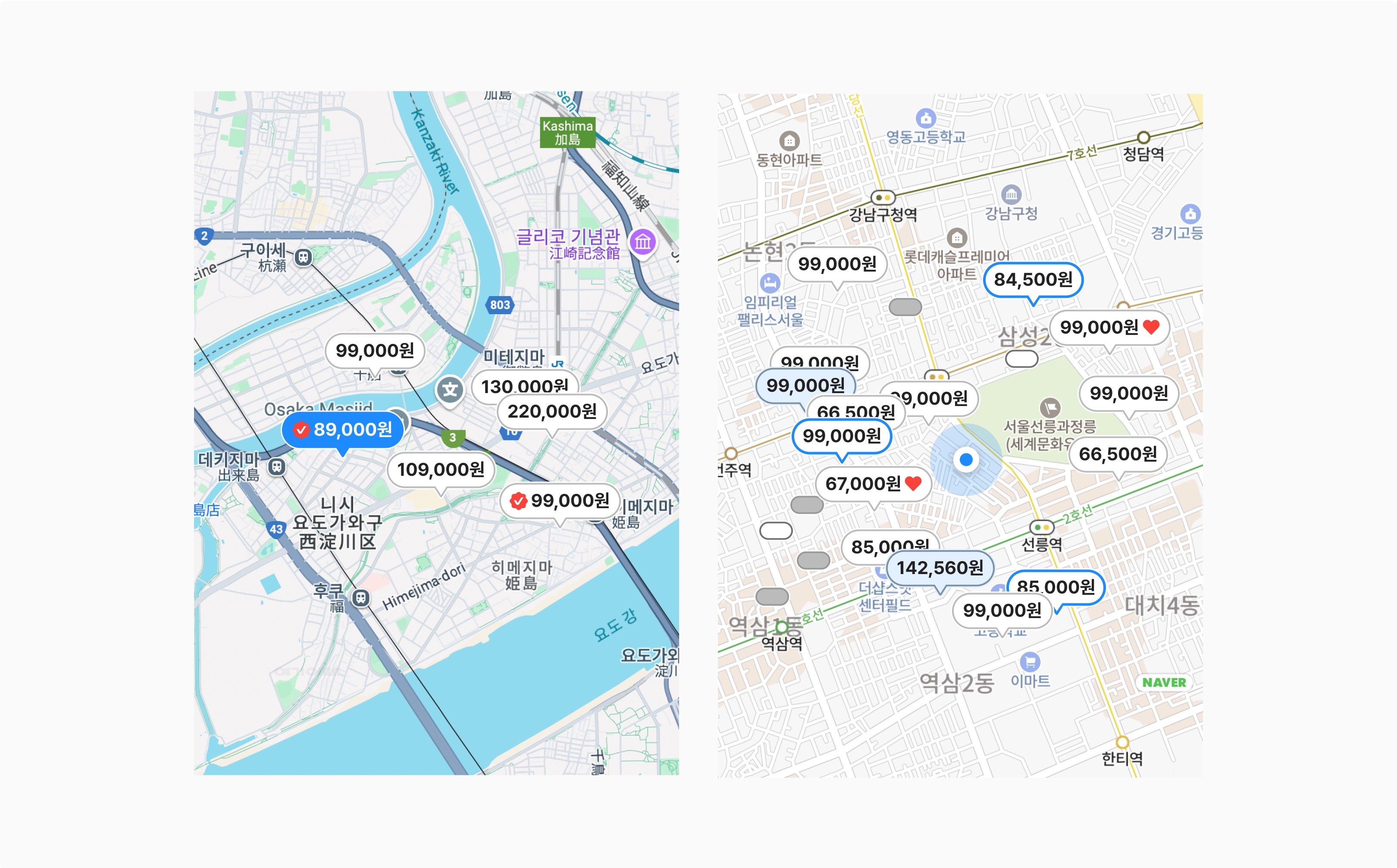 Price marker는 사용자가 주변 숙소 가격을 빠르게 파악할 수 있도록 돕습니다.