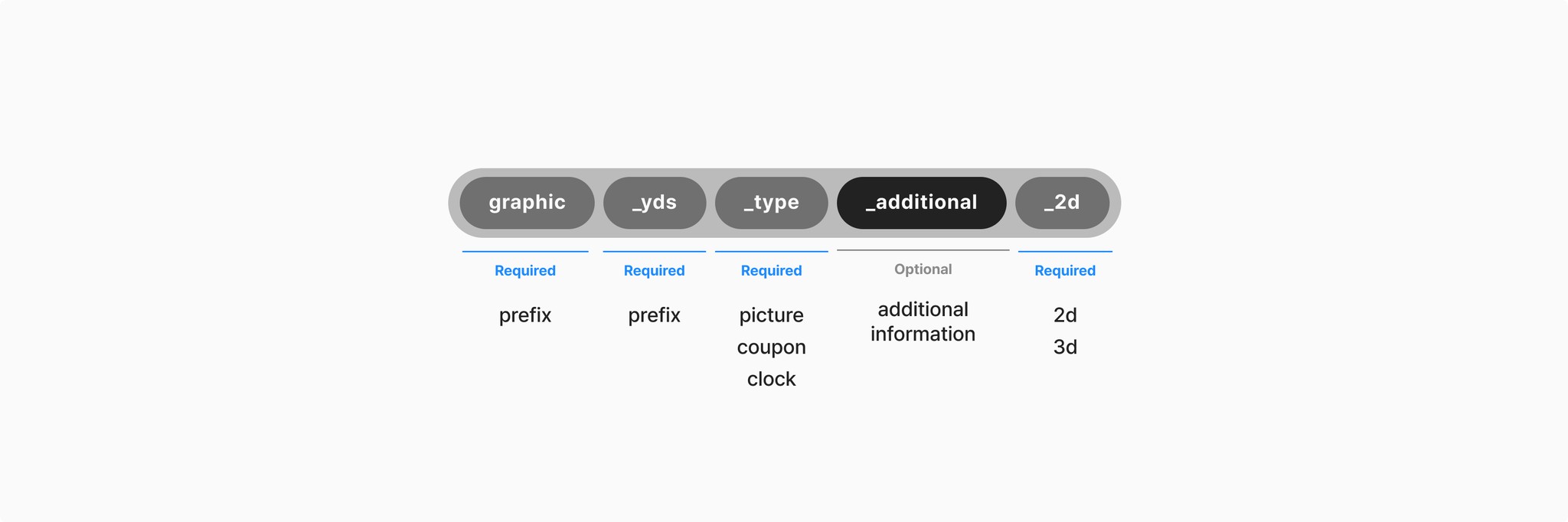 그래픽 요소를 체계적으로 관리하는 데 사용되는 네이밍 규칙입니다. 아이콘의 이름은 동사 대신 명사로 사용합니다. e.g. Object/graphic_yds_2d_picture