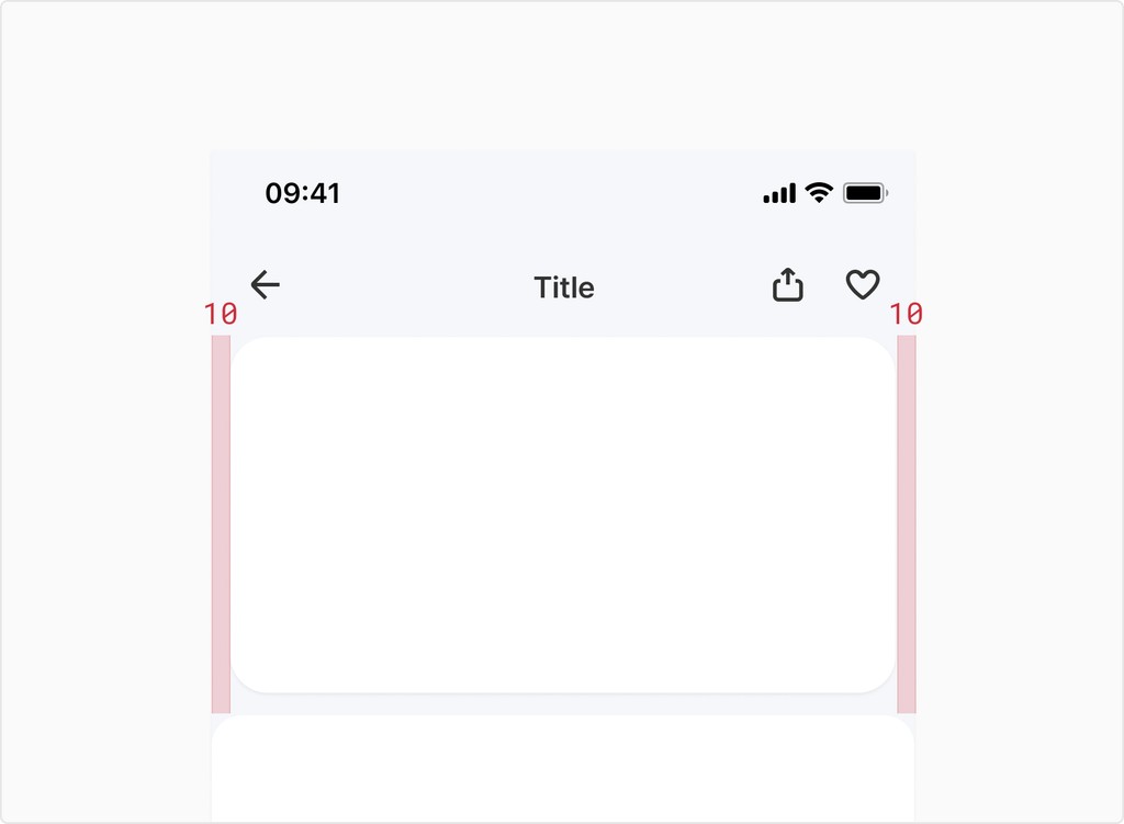 YDS 6.0에서는 기본적으로 화면 좌우에 20px의 공통 여백을 적용합니다. 그러나 Jobs To Be Done 항목을 강조할 필요가 있을 경우, ATF 영역에 모듈 타입의 컨테이너를 사용할 수 있고, 모듈이 포함된 섹션은 좌우 10px의 여백과 하단 여백 12px을 사용합니다. 모듈과 이어지는 섹션의 상단 radius는 16px을 사용합니다.