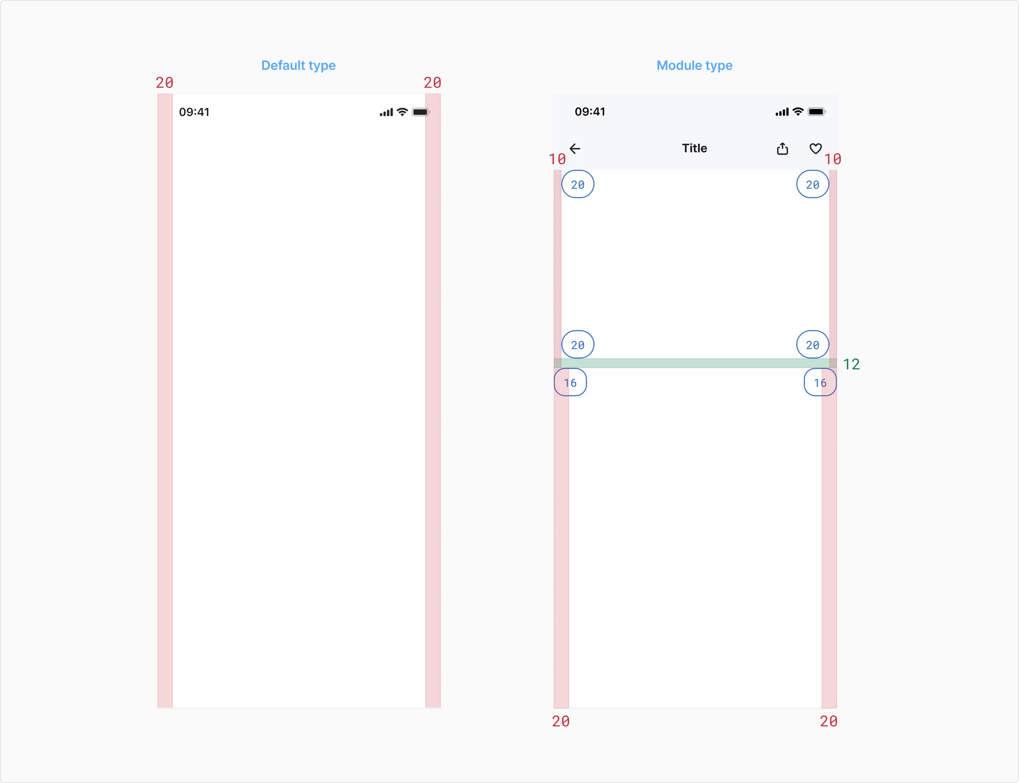 YDS 6.0에서는 기본적으로 화면 좌우에 20px의 공통 여백을 적용합니다. 그러나 Jobs To Be Done 항목 강조가 필요할 경우, ATF 영역에 모듈 타입의 컨테이너를 사용할 수 있고, 모듈이 포함된 섹션은 좌우 10px의 여백과 하단 여백 12px을 사용합니다. 모듈과 이어지는 섹션의 상단 radius는 16px을 사용합니다.